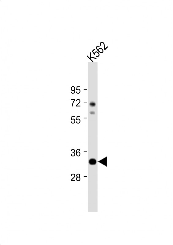 Anti-ATP1B2 Antibody (C-term) at 1:1000 dilution + K562 whole cell lysate Lysates/proteins at 20 μg per lane. Secondary Goat Anti-Rabbit IgG, (H+L), Peroxidase conjugated at 1/10000 dilution. Predicted band size : 33 kDa Blocking/Dilution buffer: 5% NFDM/TBST.