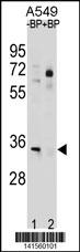 ATP1B2 Antibody (C-term) (Cat. APG02088G) western blot analysis in A549 cell line lysates (35ug/lane).This demonstrates the ATP1B2 antibody detected the ATP1B2 protein (arrow). |