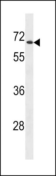 UGT2B28 Antibody (Center) (Cat. APR10635G) western blot analysis in ZR-75-1 cell line lysates (35ug/lane).This demonstrates the UGT2B28 antibody detected the UGT2B28 protein (arrow). |