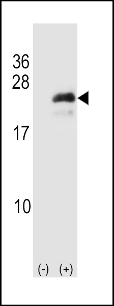 Western blot analysis of Neurogenin3 (arrow) using rabbit polyclonal Neurogenin3 Antibody (N-term) (Cat. AMM06657G). 293 cell lysates (2 ug/lane) either nontransfected (Lane 1) or transiently transfected (Lane 2) with the Neurogenin3 gene. |