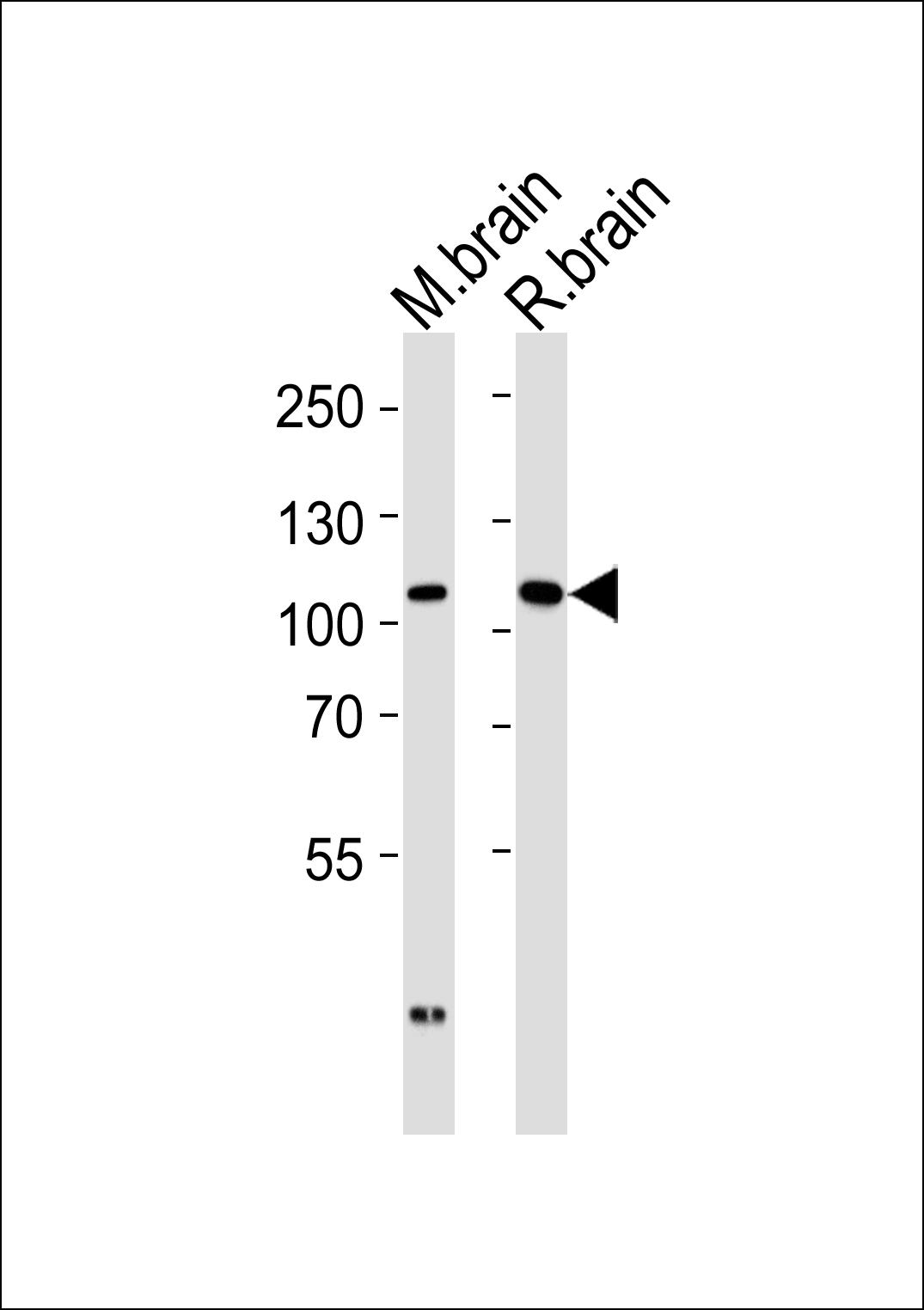 Western blot analysis of tissue lysates from mouse brain and rat brain (from left to right), using DLG2 Antibody (Center)( APR11740G). APR11740G was diluted at 1:1000 at each lane. A goat anti-rabbit IgG H&L(HRP) at 1:5000 dilution was used as the secondary antibody. Lysates at 35ug per lane. |