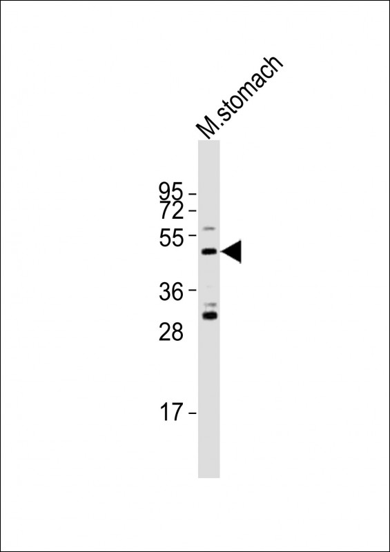 Anti-SHH Antibody (C-term)at 1:1000 dilution + mouse stomach lysates Lysates/proteins at 20 μg per lane. Secondary Goat Anti-Rabbit IgG, (H+L), Peroxidase conjugated at 1/10000 dilution Predicted band size : 50 kDa Blocking/Dilution buffer: 5% NFDM/TBST. |