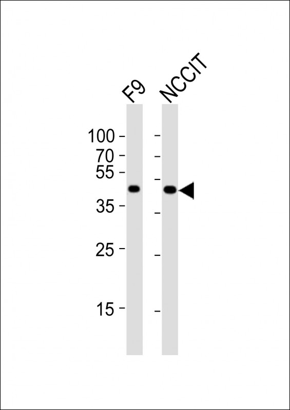 All lanes : Anti-Pou5f1 Antibody (Center) at 1:4000 dilution Lane 1: F9 whole cell lysates Lane 2: NCCIT whole cell lysates Lysates/proteins at 20 μg per lane. Secondary Goat Anti-Rabbit IgG, (H+L), Peroxidase conjugated at 1/10000 dilution Predicted band size : 38 kDa Blocking/Dilution buffer: 5% NFDM/TBST. |