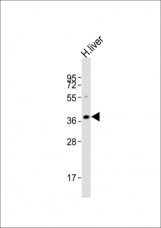 Anti-LMX1A Antibody (C-term)at 1:2000 dilution + human liver lysates Lysates/proteins at 20 μg per lane. Secondary Goat Anti-Rabbit IgG, (H+L), Peroxidase conjugated at 1/10000 dilution. Predicted band size : 43 kDa Blocking/Dilution buffer: 5% NFDM/TBST.