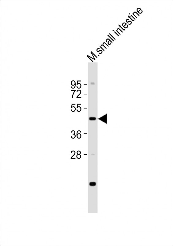 Anti-LMX1A Antibody (C-term)at 1:2000 dilution + mouse small intestine lysates Lysates/proteins at 20 μg per lane. Secondary Goat Anti-Rabbit IgG, (H+L), Peroxidase conjugated at 1/10000 dilution Predicted band size : 43 kDa Blocking/Dilution buffer: 5% NFDM/TBST. |