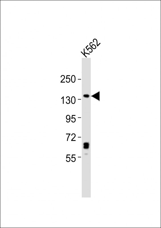 Anti-SYNJ1 Antibody (C-term)at 1:2000 dilution + K562 whole cell lysates Lysates/proteins at 20 μg per lane. Secondary Goat Anti-Rabbit IgG, (H+L), Peroxidase conjugated at 1/10000 dilution Predicted band size : 173 kDa Blocking/Dilution buffer: 5% NFDM/TBST. |