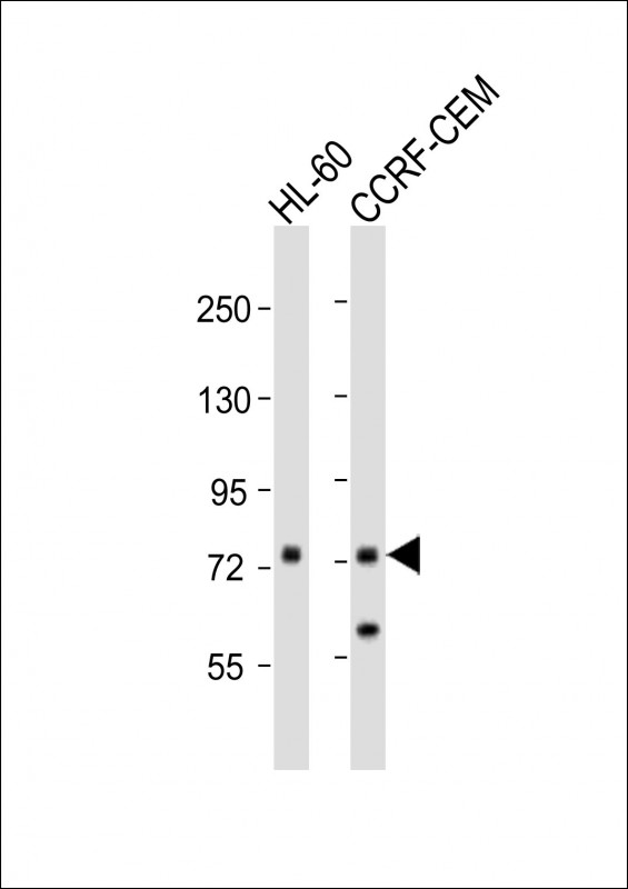 All lanes : Anti-KIF22 Antibody (Center) at 1:1000 dilution Lane 1: HL-60 whole cell lysates Lane 2: CCRF-CEM whole cell lysates Lysates/proteins at 20 μg per lane. Secondary Goat Anti-Rabbit IgG, (H+L), Peroxidase conjugated at 1/10000 dilution Predicted band size : 73 kDa Blocking/Dilution buffer: 5% NFDM/TBST. |