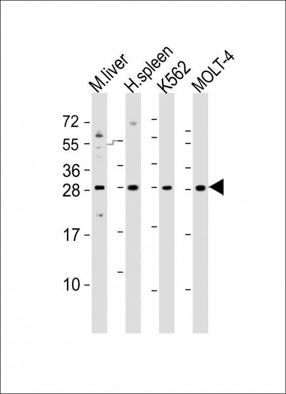 All lanes : Anti-SLA2 Antibody (Center) at 1:2000 dilution Lane 1: mouse liver lysates Lane 2: human spleen lysates Lane 3: K562 whole cell lysates Lane 4: MOLT-4 whole cell lysates Lysates/proteins at 20 μg per lane. Secondary Goat Anti-Rabbit IgG, (H+L), Peroxidase conjugated at 1/10000 dilution Predicted band size : 29 kDa Blocking/Dilution buffer: 5% NFDM/TBST. |