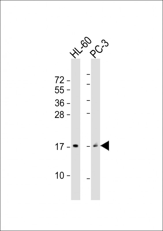 All lanes : Anti-GRP Antibody (Center) at 1:2000 dilution Lane 1: HL-60 whole cell lysate Lane 2: PC-3 whole cell lysate Lysates/proteins at 20 μg per lane. Secondary Goat Anti-Rabbit IgG, (H+L), Peroxidase conjugated at 1/10000 dilution. Predicted band size : 16 kDa Blocking/Dilution buffer: 5% NFDM/TBST. |