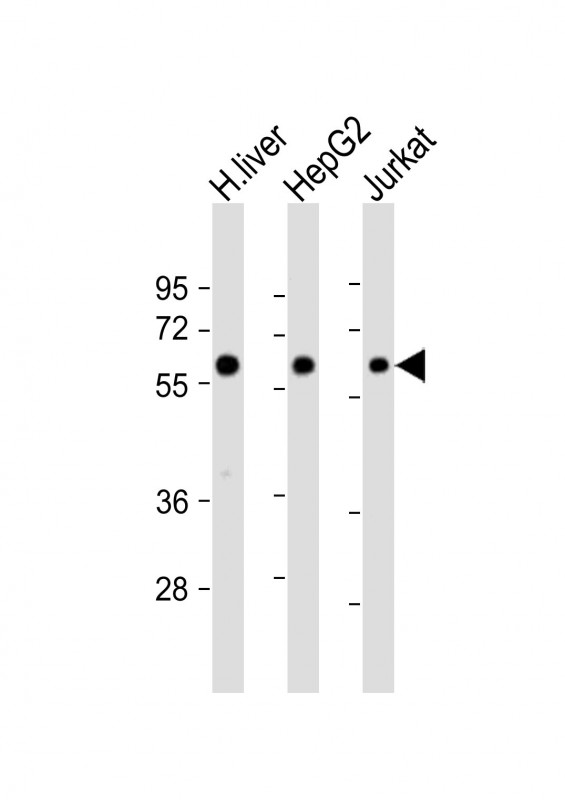 All lanes : Anti-CYP2E1 Antibody (Center) at 1:4000 dilution Lane 1: human liver lysate Lane 2: HepG2 whole cell lysate Lane 3: Jurkat whole cell lysate Lysates/proteins at 20 μg per lane. Secondary Goat Anti-Rabbit IgG, (H+L), Peroxidase conjugated at 1/10000 dilution. Predicted band size : 57 kDa Blocking/Dilution buffer: 5% NFDM/TBST. |