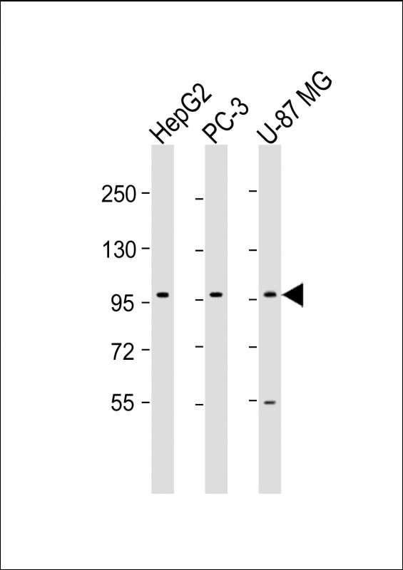All lanes : Anti-PCDH10 Antibody (N-Term) at 1:1000-1:2000 dilution Lane 1: HepG2 whole cell lysate Lane 2: PC-3 whole cell lysate Lane 3: U-87 MG whole cell lysate Lysates/proteins at 20 μg per lane. Secondary Goat Anti-Rabbit IgG, (H+L), Peroxidase conjugated at 1/10000 dilution. Predicted band size : 113 kDa Blocking/Dilution buffer: 5% NFDM/TBST. |