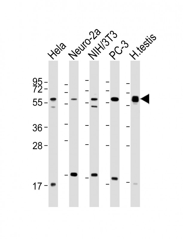 All lanes : Anti-TXNRD1 Antibody (C-Term) at 1:2000 dilution Lane 1: Hela whole cell lysate Lane 2: Neuro-2a whole cell lysate Lane 3: NIH/3T3 whole cell lysate Lane 4: PC-3 whole cell lysate Lane 5: human testis lysate Lysates/proteins at 20 μg per lane. Secondary Goat Anti-Rabbit IgG, (H+L), Peroxidase conjugated at 1/10000 dilution. Predicted band size : 71 kDa Blocking/Dilution buffer: 5% NFDM/TBST. |