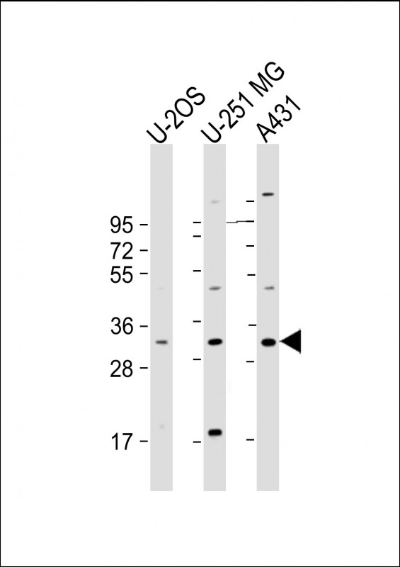 All lanes : Anti-FAM125A Antibody (Center) at 1:2000 dilution Lane 1: U-2OS whole cell lysate Lane 2: U-251 MG whole cell lysate Lane 3: A431 whole cell lysate Lysates/proteins at 20 μg per lane. Secondary Goat Anti-Rabbit IgG, (H+L), Peroxidase conjugated at 1/10000 dilution. Predicted band size : 29 kDa Blocking/Dilution buffer: 5% NFDM/TBST. |