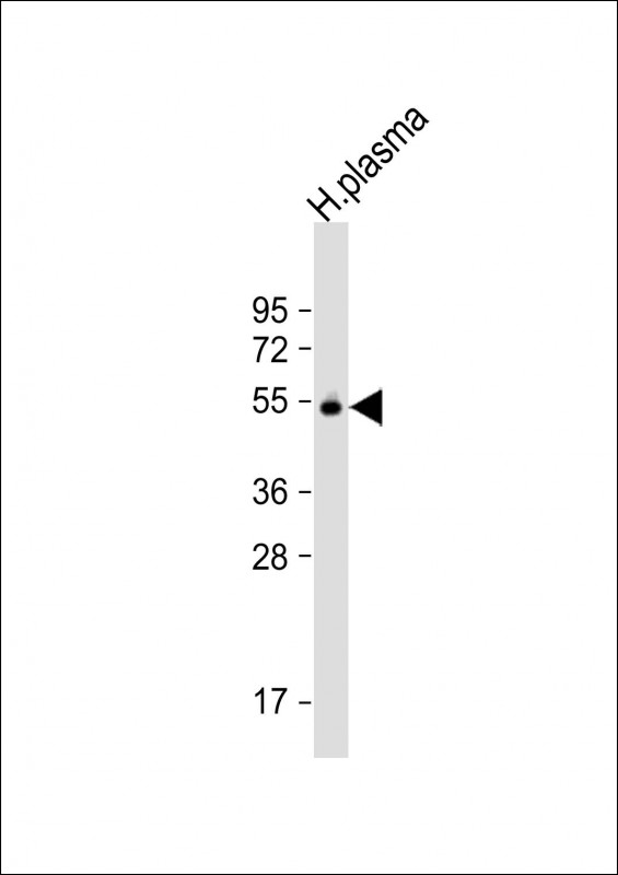 Anti-GC Antibody (N-Term) at 1:2000 dilution + human plasma lysate Lysates/proteins at 20 μg per lane. Secondary Goat Anti-Rabbit IgG, (H+L), Peroxidase conjugated at 1/10000 dilution. Predicted band size : 53 kDa Blocking/Dilution buffer: 5% NFDM/TBST. |