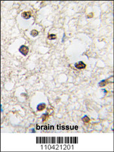 Formalin-fixed and paraffin-embedded human brain tissue reacted with QKI Antibody (N-term) (Cat. APR13034G), which was peroxidase-conjugated to the secondary antibody, followed by DAB staining. This data demonstrates the use of this antibody for immunohistochemistry; clinical relevance has not been evaluated. |