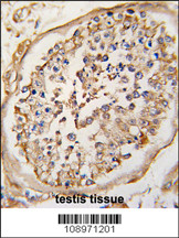 Formalin-fixed and paraffin-embedded human testis tissue reacted with NARP(Nptx2) Antibody (Center) (Cat. AMM06784G), which was peroxidase-conjugated to the secondary antibody, followed by DAB staining. This data demonstrates the use of this antibody for immunohistochemistry; clinical relevance has not been evaluated. |