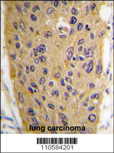 Formalin-fixed and paraffin-embedded human lung carcinoma tissue reacted with WIF1 Antibody (C-term) (Cat. AMM08517G), which was peroxidase-conjugated to the secondary antibody, followed by DAB staining. This data demonstrates the use of this antibody for immunohistochemistry; clinical relevance has not been evaluated. |