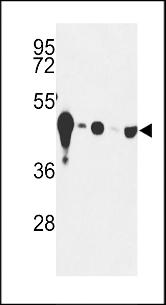 Western blot analysis of NSE-Y25 Antibody (Cat. APR08840G) in mouse cerebellum tissue and Y79, HepG2, Jurkat, CEM cell line lysates (35ug/lane). NSE (arrow) was detected using the purified Pab.