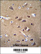 NSE Antibody (Y25) (Cat. APR08840G)immunohistochemistry analysis in formalin fixed and paraffin embedded human brain tissue followed by peroxidase conjugation of the secondary antibody and DAB staining.This data demonstrates the use of NSE Antibody (Y25) for immunohistochemistry. Clinical relevance has not been evaluated. |
