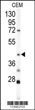 Western blot analysis of KRT19 Antibody (C-term) (Cat. APR17098G) in CEM cell line lysates (35ug/lane). KRT19 (arrow) was detected using the purified Pab.