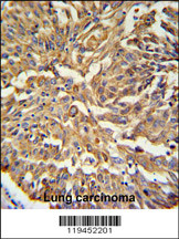 KRT19 Antibody (C-term) (Cat. APR17098G) IHC analysis in formalin fixed and paraffin embedded human Lung carcinoma followed by peroxidase conjugation of the secondary antibody and DAB staining. This data demonstrates the use of the KRT19 Antibody (C-term) for immunohistochemistry. Clinical relevance has not been evaluated. |