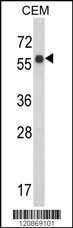 Western blot analysis of WDR1 Antibody (C-term) (Cat. AMM08509G) in CEM cell line lysates (35ug/lane).WDR1 (arrow) was detected using the purified Pab. |