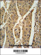 PRDX6 Antibody (Center) (Cat. AMR09505G) immunohistochemistry analysis in formalin fixed and paraffin embedded human hepatocarcinoma followed by peroxidase conjugation of the secondary antibody and DAB staining. This data demonstrates the use of the PRDX6 Antibody (Center) for immunohistochemistry. Clinical relevance has not been evaluated.