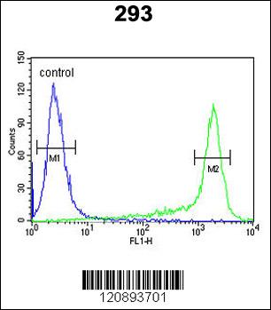 PRDX6 Antibody (Center) (Cat. AMR09505G) flow cytometric analysis of 293 cells (right histogram) compared to a negative control cell (left histogram).FITC-conjugated goat-anti-rabbit secondary antibodies were used for the analysis. |