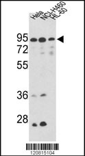 Western blot analysis of IMMT Antibody (Center) (Cat. APR07992G) in Hela, NCI-H460, CEM cell line lysates (35ug/lane). IMMT (arrow) was detected using the purified Pab.