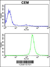 IMMT Antibody (Center) (Cat. APR07992G) flow cytometric analysis of CEM cells (bottom histogram) compared to a negative control cell (top histogram).FITC-conjugated goat-anti-rabbit secondary antibodies were used for the analysis. |