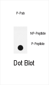 Dot blot analysis of anti-Phospho-LPR1-S4520 Antibody (Cat. APR09187G) on nitrocellulose membrane. 50ng of Phospho-peptide or Non Phospho-peptide per dot were adsorbed. Antibody working concentrations are 0.5ug per ml.