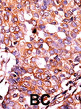 Formalin-fixed and paraffin-embedded human cancer tissue reacted with the primary antibody, which was peroxidase-conjugated to the secondary antibody, followed by DAB staining. This data demonstrates the use of this antibody for immunohistochemistry; clinical relevance has not been evaluated. BC = breast carcinoma; HC = hepatocarcinoma. |