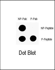Dot blot analysis of anti-Phospho-P53-S9 Antibody (Cat. APG02960G) on nitrocellulose membrane. 50ng of Phospho-peptide or Non Phospho-peptide per dot were adsorbed. Antobodies working concentration was 0.5ug per ml.