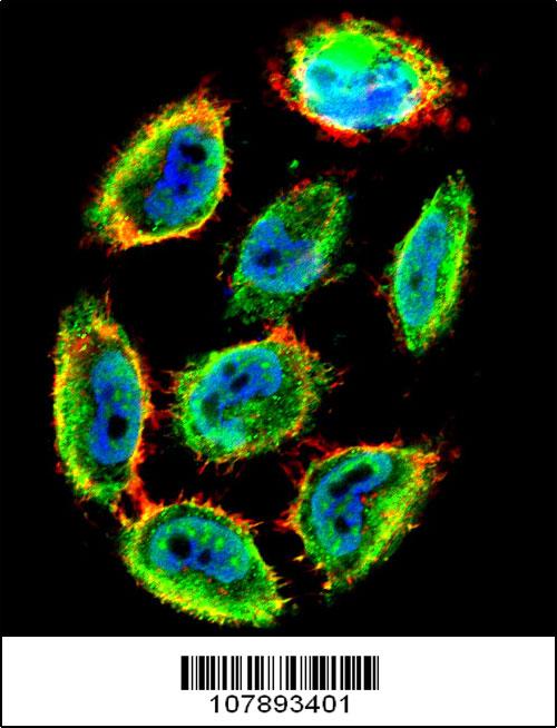 Confocal immunofluorescent analysis of Phospho-P53-S9 Antibody( APG02960G) with A2058 cell followed by Alexa Fluor 488-conjugated goat anti-rabbit lgG (green). Actin filaments have been labeled with Alexa Fluor 555 phalloidin (red).DAPI was used to stain the cell nuclear (blue). |