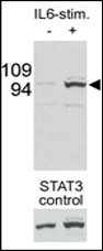 The Phospho-STAT3-S727 Pab (Cat. 3260a) is used in western blot to detect Ser727-phosphorylated STAT3 in mouse liver tissue lysates collected before (-) or after (+) stimulation obtained by IL-6 injection in mouse portal vein. Data is kindly provided by Drs. E. Bard-Chapeau and G-S. Feng from the Burnham Institute (La Jolla, CA).