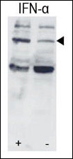 The phospho-STAT3-Ser727 Pab (Cat. APR11163G) is used in Western blot to detect Ser727-phosphorylated STAT3 in HL-60 tissue lysates collected before (-) or after (+) stimulation obtained by IFN-a. |