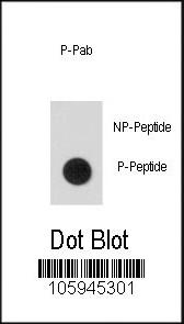 Dot blot analysis of anti-Phospho-hSTAT5a-pS726 Phospho-specific Antibody (Cat. APR09233G) on nitrocellulose membrane. 50ng of Phospho-peptide or Non Phospho-peptide per dot were adsorbed. Antibody working concentrations are 0.5ug per ml.