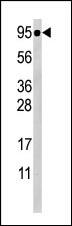 Western blot analysis of anti-Phospho-STAT5a-S726 Antibody(Cat. APR09233G) in CEM cell line lysate (35ug/lane). Phospho-STAT5a(arrow) was detected using the purified Pab.