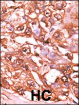 Formalin-fixed and paraffin-embedded human cancer tissue reacted with the primary antibody, which was peroxidase-conjugated to the secondary antibody, followed by AEC staining. This data demonstrates the use of this antibody for immunohistochemistry; clinical relevance has not been evaluated. BC = breast carcinoma; HC = hepatocarcinoma. |