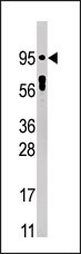 Western blot analysis of anti-Phospho-STAT5 Pab(Cat. APR07156G) in HepG2 cell line lysate (35ug/lane). Phospho-STAT5(arrow) was detected using the purified Pab.
