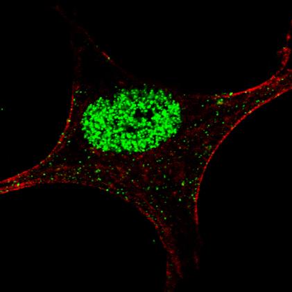 Fluorescent confocal image of an SY5Y cell stained with APR07156G Phospho-STAT5a antibody. SY5Y cells were fixed with 4% PFA (20 min), permeabilized with Triton X-100 (0.2%, 30 min), then incubated with APR07156G Phospho-STAT5a primary antibody (1:200, 2 h at room temperature). For secondary antibody, Alexa Fluor? 488 conjugated donkey anti-rabbit antibody (green) was used (1:1000, 1h).Cytoplasmic actin was counterstained with Alexa Fluor? 555 (red) conjugated Phalloidin (5.25 μM, 25 min). Nuclei were counterstained with Hoechst 33342 (blue) (10 μg/ml, 3 min)(not shown). Phospho-STAT5a immunoreactivity is localized exclusively to the nucleus.
