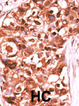 Formalin-fixed and paraffin-embedded human cancer tissue reacted with the primary antibody, which was peroxidase-conjugated to the secondary antibody, followed by DAB staining. This data demonstrates the use of this antibody for immunohistochemistry; clinical relevance has not been evaluated. BC = breast carcinoma; HC = hepatocarcinoma. |