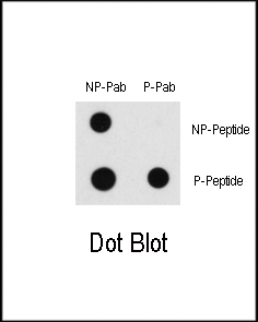 Dot blot analysis of Phospho-RAF1-S43 Phospho-specific Pab (Cat.APR09218G) on nitrocellulose membrane. 50ng of Phospho-peptide or Non Phospho-peptide per dot were adsorbed. Antobodies working concentration was 0.5ug per ml. |