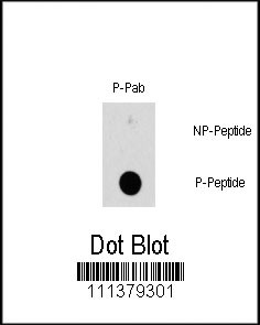 Dot blot analysis of Phospho-HSBP1-S78 polyclonal antibody ( APG02957G) on nitrocellulose membrane. 50ng of Phospho-peptide or Non Phospho-peptide per dot were adsorbed. Antibody working concentration was 0.5ug per ml. P-Pab: phospho-antibody; P-Peptide: phospho-peptide; NP-Peptide: non-phospho-peptide. |