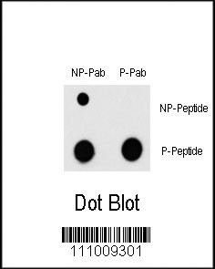 Dot blot analysis of Phospho-MEF2C-T300 Antibody (Cat. APR12813G) and MEF2C Non Phospho-specific Pab on nitrocellulose membrane. 50ng of Phospho-peptide or Non Phospho-peptide per dot were adsorbed. Antibody working concentrations are 0.5ug per ml. |