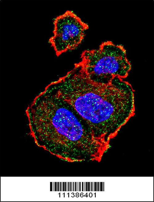 Confocal immunofluorescent analysis of Phospho-TSC2-pS939 Antibody( APR09264G) with MCF-7 cell followed by Alexa Fluor 488-conjugated goat anti-rabbit lgG (green).Actin filaments have been labeled with Alexa Fluor 555 phalloidin (red).DAPI was used to stain the cell nuclear (blue). |