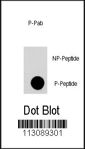 Dot blot analysis of anti-FRAP1-pT2446 Phospho-specific Pab (Cat.APR07148G) on nitrocellulose membrane. 50ng of Phospho-peptide or Non Phospho-peptide per dot were adsorbed. Antibody working concentrations are 0.5ug per ml. |