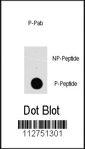 Dot blot analysis of anti-MAP4K1-pS171 Phospho-specific Pab (RB12751) on nitrocellulose membrane. 50ng of Phospho-peptide or Non Phospho-peptide per dot were adsorbed. Antibody working concentrations are 0.5ug per ml. |
