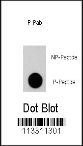 Dot blot analysis of anti-RPS6KA3-pS369 Phospho-specific Pab (RB13311) on nitrocellulose membrane. 50ng of Phospho-peptide or Non Phospho-peptide per dot were adsorbed. Antibody working concentrations are 0.5ug per ml. |