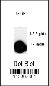 Dot blot analysis of anti-Phospho-LINGO-1(LRRN6A)-pS596 Pab (Cat. APR12805G) on nitrocellulose membrane. 50ng of Phospho-peptide or Non Phospho-peptide per dot were adsorbed. Antibody working concentrations are 0.5ug per ml. |